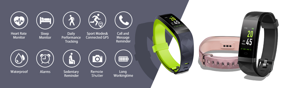 | Function | 24H heart rate monitoring, sleep monitoring, pedometer, calorie burned, distance, multiple sports modes (default 3 kinds: walking, running, cycling; 11 kinds of options: tennis, soccer, climbing, spinning, Yoga, Dance, Treadmill, Hiking, Fitness, Basketball, Badminton), Time Display (12h/24h), Message Alert (Support SMS, WeChat, QQ, Facebook, WhatsApp, Twitter, Instagram, Messenger, LinkedIn, Email, Calendar Reminder, LINE, VIBER, Skype, KakaoTalk, VKontakte), Sedentary Reminder, Call Reminder, Complete Target Reminder, Alarm clock, Low Battery Reminder, Device Anomaly, Wrist sense, Remote camera control, brightness control on APP |