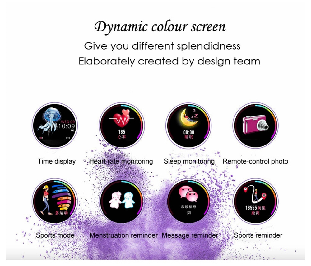 | Main Function | calories, steps, distance, heart rate monitor, sleeping monitor, caller alarm, Female Physiological cycle, sedentary, smart alarm clock, call reminder, sms reminder, QQ reminder, whatsAPP reminder |