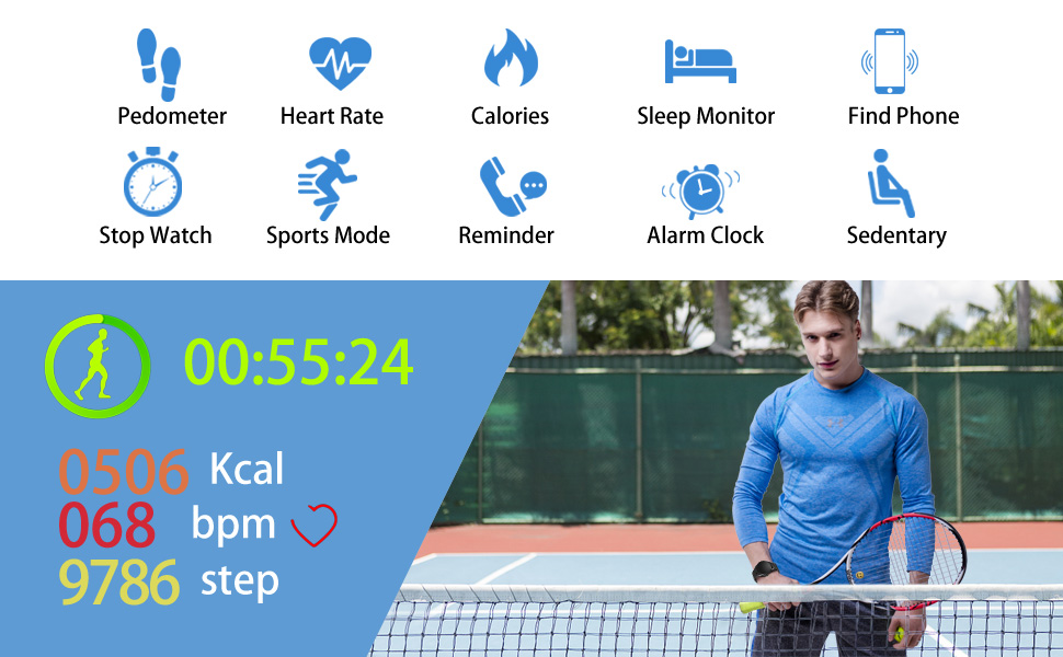 | Function | Main interface,pedometer, heart rate, blood pressure, sleep monitor, multi sport modes,message reminder,stopwatch, find your phone, shutdown etc |